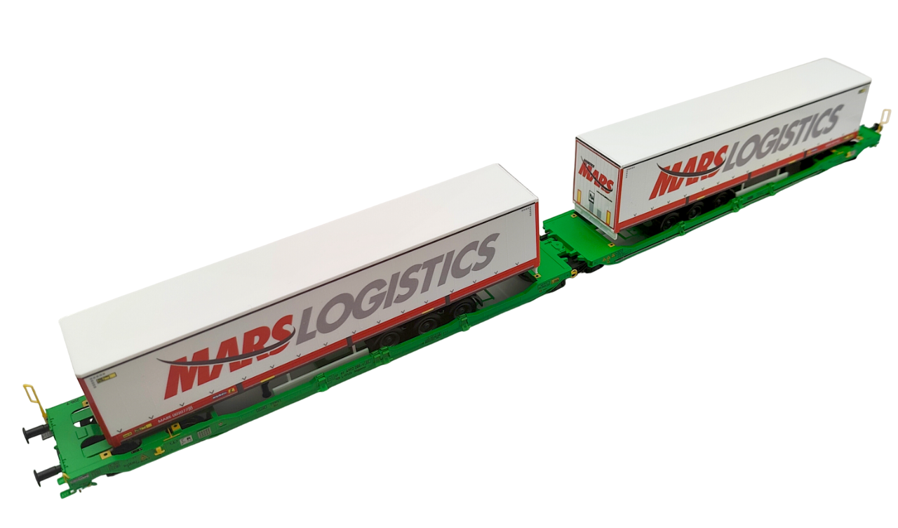 - Double wagon-poche à 6 essieux, articulé, type Sdggmrss (T3000e) des CFL Cargo. Wagon porteur moderne pour le transport combiné rail-route. Livrée de base vert pur. Version avec quatre verrous latéraux rabattables. Etat de service à partir de 2021. Chargé de deux semi-remorques à bâche coulissante de l'entreprise de transport Mars.