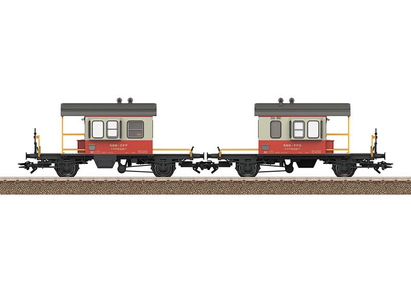 Deux anciens wagons d'accompagnement type Db des Chemins de fer fédéraux suisses (CFF/SBB/FFS). Livrée de base gris silex/orange sanguine, utilisés comme wagons d'accouplement du Swiss Express. Etat de service à partir de 1975.