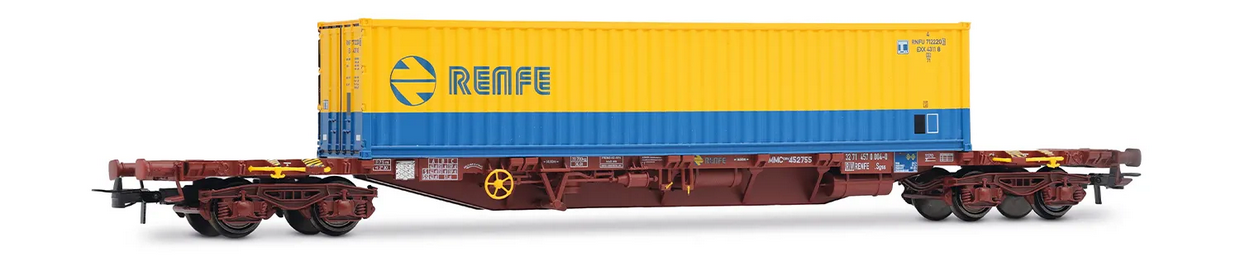 WAGON PORTE CONTENEURS À 4 ESSIEUX MMC3 CHARGÉ AVEC UN CONTENEUR DE 40' RENFE EN LIVRÉE ROUGE OXYDÉ ÉPOQUE IV