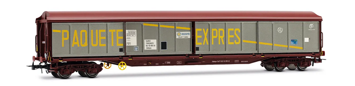 WAGON PAROIS COULISSANTE À 4 ESSIEUX PAQUETE-EXPRES AVEC PORTES INVERSES, EN LIVRÉE ARGENT-ROUGE OXYDÉ, ÉPOQUE IV