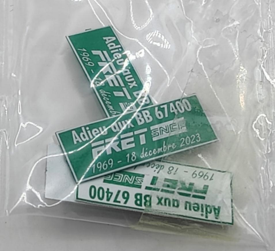 LOCOMOTIVE DIESEL BB 67400 SNCF "ADIEU AUX BB 67400 FRET" (2 PLAQUES VERTES + 2 PLAQUES BLANCHES)