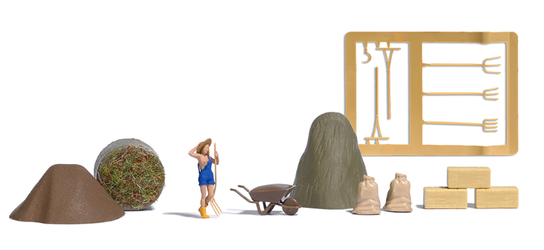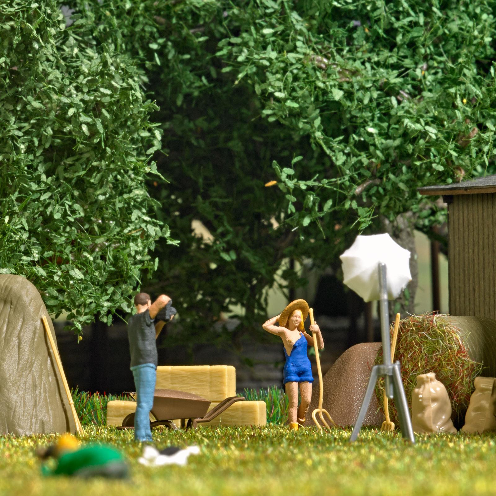 Un modèle, légèrement vêtu, prend la pose sur le thème de la récolte de foin. Avec tas de paille, meule de foin, sacs et outils d’étable. Convient aussi pour un shooting photo, en combinaison avec les photographes H0