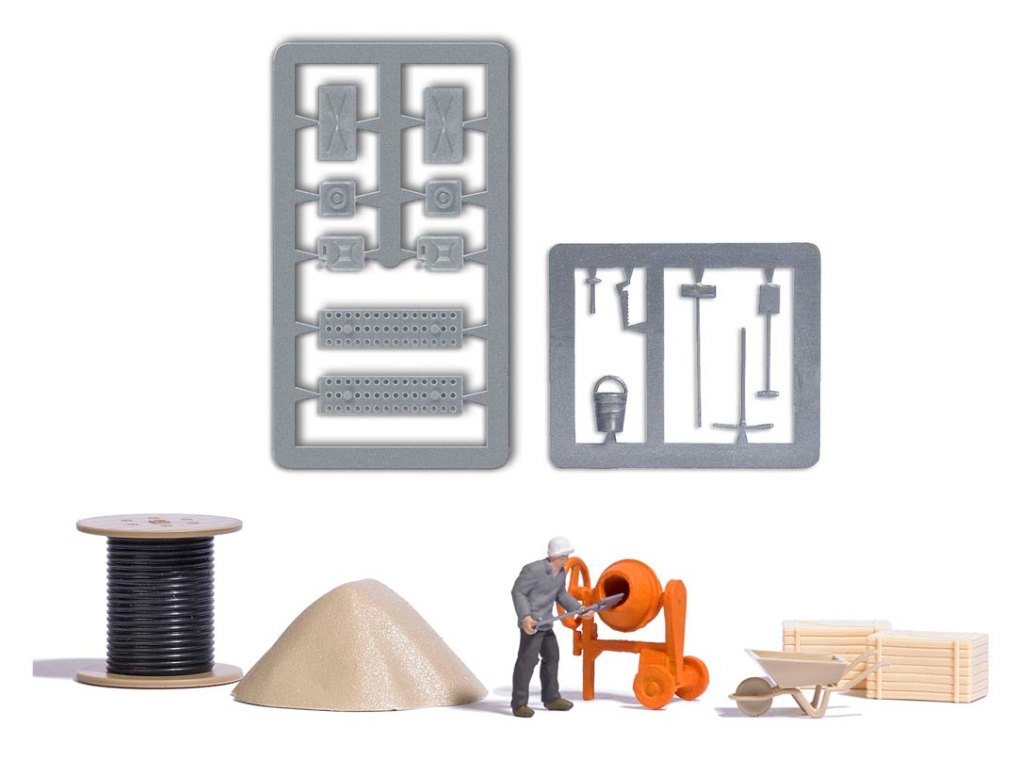Cet ouvrier et une bétonneuse trouverons facilement une place sur de nombreux chantiers. Livré avec beaucoup d´ accessoires: bétonneuse, brouette, tas de sable, outils, caisses à outils, jerricanes, tôles de passage, rouleau de câble et ouvrier.