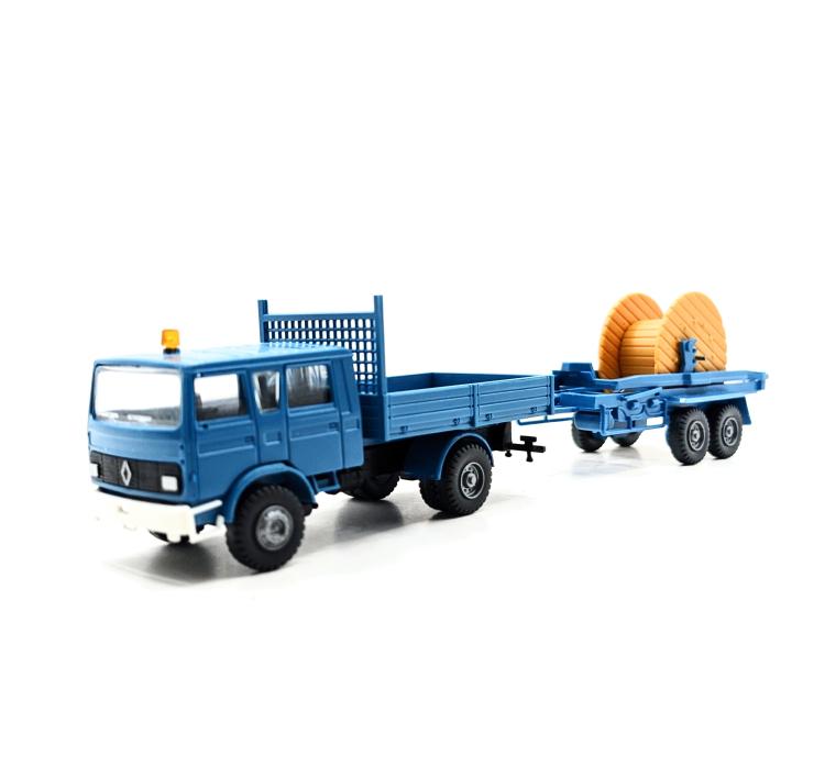 PORTEUR RENAULT S170 À DOUBLE CABINE BLEU AVE C REMORQUE POSEUR DE CBLES ( EDF GDF )