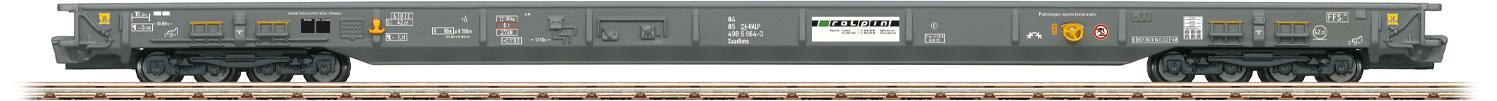 Wagon de transport à plancher surbaissé type Saadkms de la société allemande RAlpin AG (Olten), pour le trafic de transit de la « Route roulante ». Livrée de base gris quartz. Etat de service à partir de 2018.