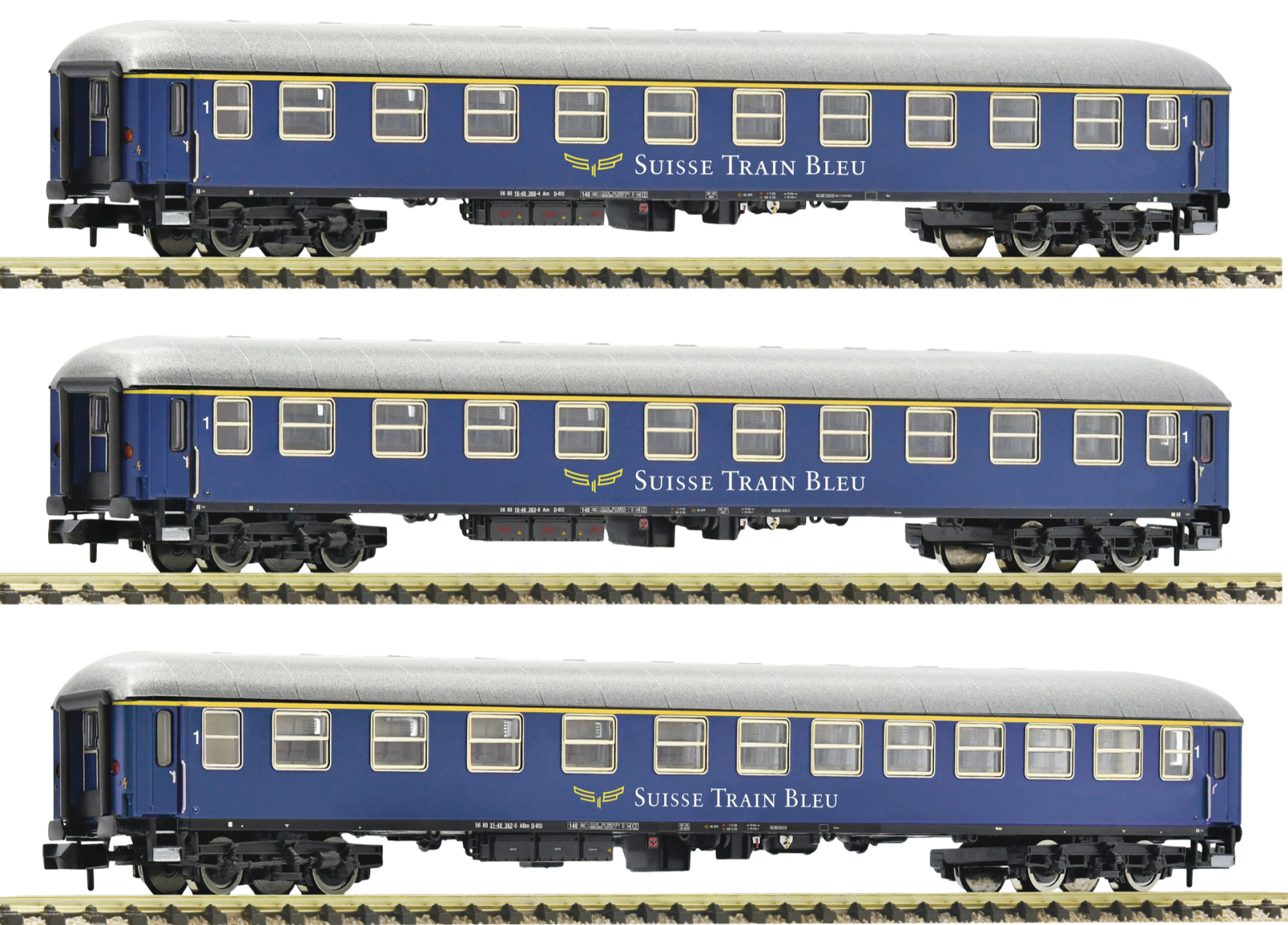 Coffret 1 avec trois voitures de train rapide "Suisse Train Bleu".