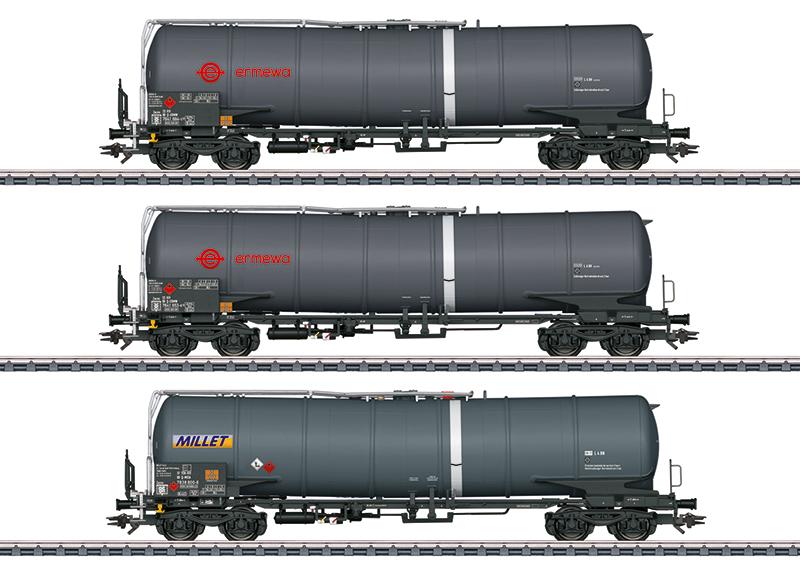 trois wagons-citernes Zacns d'une capacité de 95m3. Deux wagons privés de la Ermewa SA, un wagon privé de la Millet SAS. Tous les wagons sont immatriculés en Allemagne. Etat de service vers 2009.