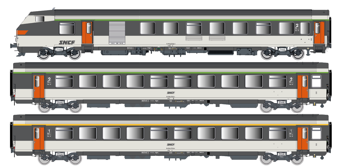 SET DE 3 VOITURES VOYAGEURS/PILOTE REVERSIBLE 4 CABLOTS VU B6Dux + VTU B11tu + VTU A10tu LICREE CORAIL SNCF - 3 RAILS (A RESERVER)