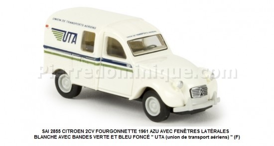 CITROEN 2CV FOURGONNETTE 1961 AZU AVEC FENÊTRES LATÉRALES BLANCHE AVEC BANDES VERTE ET BLEU FONCÉ '' UTA (union de transport aériens) '' (F)