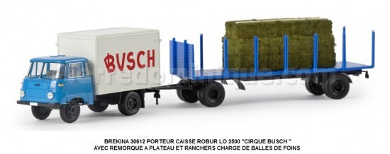PORTEUR CAISSE ROBUR LO 2500 "CIRQUE BUSCH " AVEC REMORQUE À PLATEAU ET RANCHERS CHARGÉ DE BALLES DE FOINS
