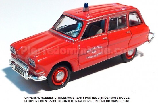 BREAK 5 PORTES CITRÖEN AMI 6 ROUGE, POMPIERS DU SERVICE DÉPARTEMENTAL CORSE, INTÉRIEUR GRIS DE 1968