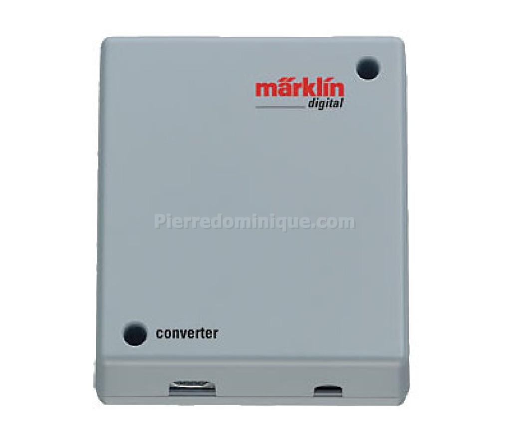 Onduleur pour les convertisseurs réf. 66361 resp. 60061 pour la transformation du courant continu en courant alternatif ou pour le raccordement d'accessoires fonctionnant sous courant continu. La tension alternative peut être utilisée pour les articles électromagnétiques devant être commutés sous courant alternatif, pour les passages à niveau ainsi que pour l'alimentation d'appareils de commande fonctionnant uniquement sous tension alternative (tels que les appareils réf. 6021, 6015, 6017). La tension continue peut être utilisée par exemple pour l'alimentation de l'éclairage du réseau, pour des accessoires compatibles, ou pour des appareils de commande. La face frontale présente à cet effet une prise (pour réf. 66361) ainsi qu'un mini connecteur DIN pour courant de forte intensité (pour réf. 60061), et le dos une prise pour courant continu et une prise pour courant alternatif. Dimensions 96 x 85 x 40 mm.