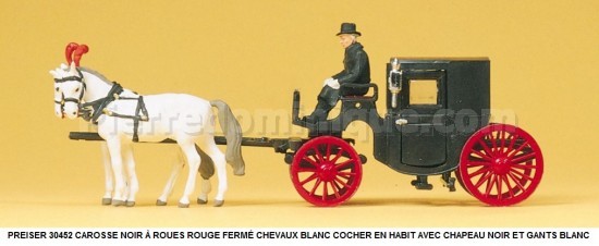 CAROSSE NOIR À ROUES ROUGE FERMÉ CHEVAUX BLANC COCHER EN HABIT AVEC CHAPEAU NOIR ET GANTS BLANC