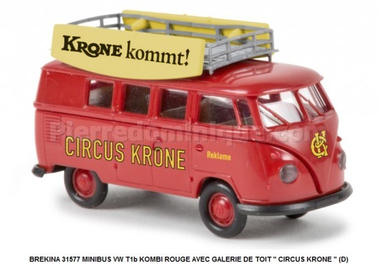 MINIBUS VW T1b KOMBI ROUGE AVEC GALERIE DE TOIT CIRCUS KRONE (D)