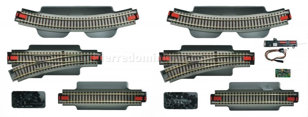 Contenu: 12 pistes courbes R4, 4 droite pistes G200, 8 droit pistes G185, 2 aiguillages gauche et à droite de chaque équipé avec des moteurs et des décodeurs de participation électrique, 1 participation avec moteur électrique et d'un décodeur chacun pour rénover le démarreur fixe 41501, 41505, 41503, 41502, 41508, 41504.