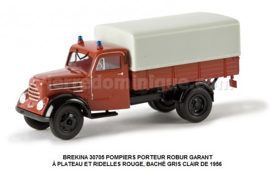 POMPIERS PORTEUR ROBUR GARANT À PLATEAU ET RIDELLES,ROUGE, BACHÉ GRIS CLAIR DE 1956