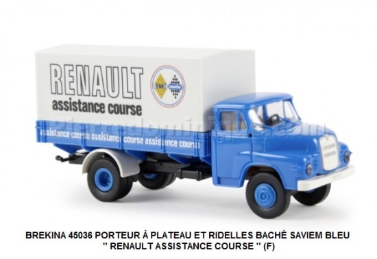 PORTEUR À PLATEAU ET RIDELLES BACHÉ SAVIEM BLEU '' RENAULT ASSISTANCE COURSE '' (F)