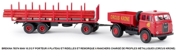PORTEUR MAN 10.212 F À PLATEAU ET RIDELLES ET REMORQUE À RANCHERS CHARGÉ DE PROFILES MÉTALLIQUES (CIRCUS KRONE)