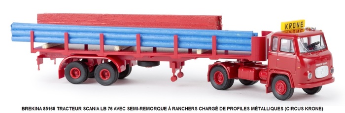 TRACTEUR SCANIA LB 76 AVEC SEMI-REMORQUE À RANCHERS CHARGÉ DE PROFILES MÉTALLIQUES (CIRCUS KRONE)
