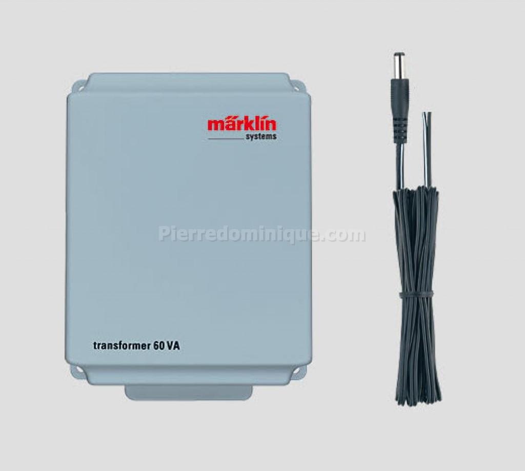 Transformateur avec câble de branchement. Convient pour alimenter les articles Märklin électromagnétiques commandés de manière conventionnelle. Sortie en tension alternative 16 V. Habillage en plastique. Dimensions 150 x 110 x 80 mm. Contrôle de sécurité effectué. Il n'est pas permis de placer le transformateur 60052/60055 à extérieur. Il doit être à l'abri de l'humidité.