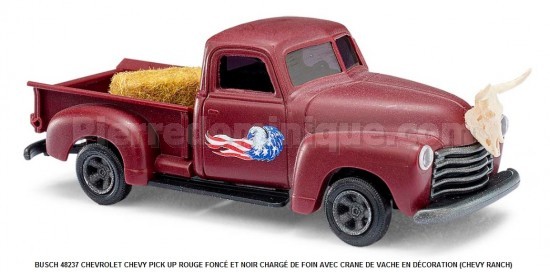CHEVROLET CHEVY PICK UP ROUGE FONCÉ ET NOIR CHARGÉ DE FOIN AVEC CRANE DE VACHE EN DÉCORATION (CHEVY RANCH)