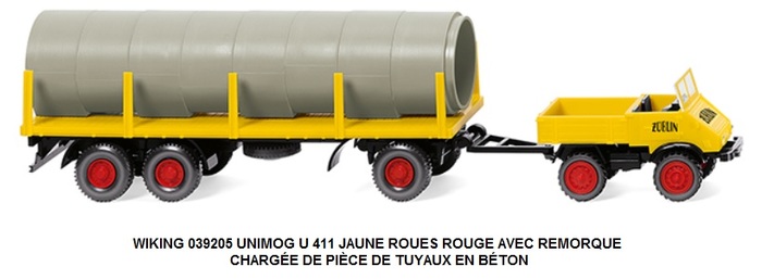 UNIMOG U 411 JAUNE ROUES ROUGE AVEC REMORQUE CHARGÉE DE PIÈCE DE TUYAUX EN BÉTON
