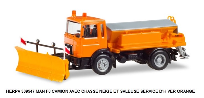MAN F8 CAMION AVEC CHASSE NEIGE ET SALEUSE SERVICE D'HIVER ORANGE