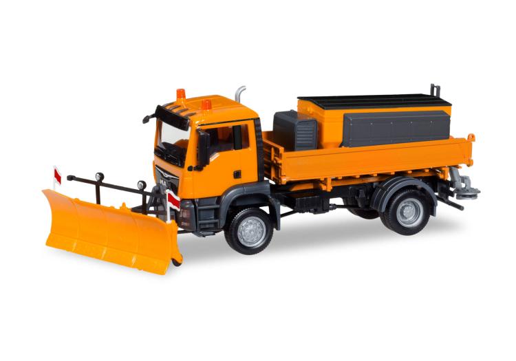 PORTEUR MAN TGS M Euro 6c 4X4 BENNE 2 ESIEUX AVEC CHASSE NEIGE ET SALEUSE SERVICE D'HIVER ORANGE