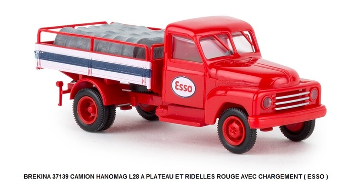 CAMION HANOMAG L28 A PLATEAU ET RIDELLES ROUGE AVEC CHARGEMENT ( ESSO )