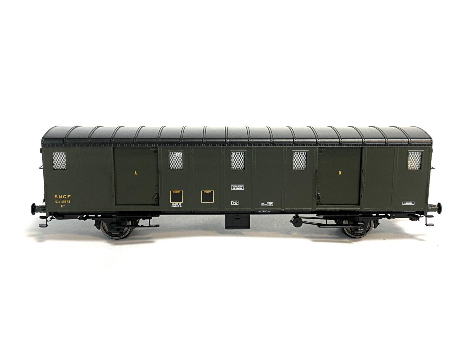 FOURGON OCEM 30 TOIT RIVETÉ ET BOUTS NOIRS, 2 PETITS FEUX ET 1 CENTRAL, BOITES À COUSSINETS, "LIMOGES" EX-PO GRILLES AUX FENÊTRES N°49842 EP.III SNCF - FEUX DE FIN DE CONVOI ET PORTES OUVRANTES AVEC DÉCODEUR