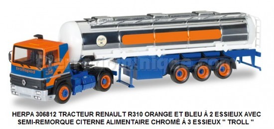 TRACTEUR RENAULT R310 ORANGE ET BLEU À 2 ESSIEUX AVEC SEMI-REMORQUE CITERNE ALIMENTAIRE CHROMÉ Ã€ 3 ESSIEUX " TROLL "