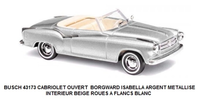 BUSCH 43173 CABRIOLET OUVERT BORGWARD ISABELLA ARGENT METALLISEE INTERIEUR BEIGE ROUES A FLANCS BLANC