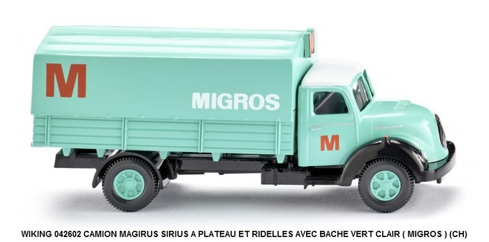 CAMION MAGIRUS SIRIUS A PLATEAU ET RIDELLES AVEC BACHE VERT CLAIR ( MIGROS ) (CH)