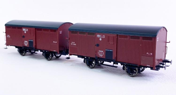 SET DE 2 WAGONS PRIMEURS 10 T PLM (FRISES BOIS VERTICALES) ROUGE SIDEROS, N° HP 1245 ET HP 982, PLM