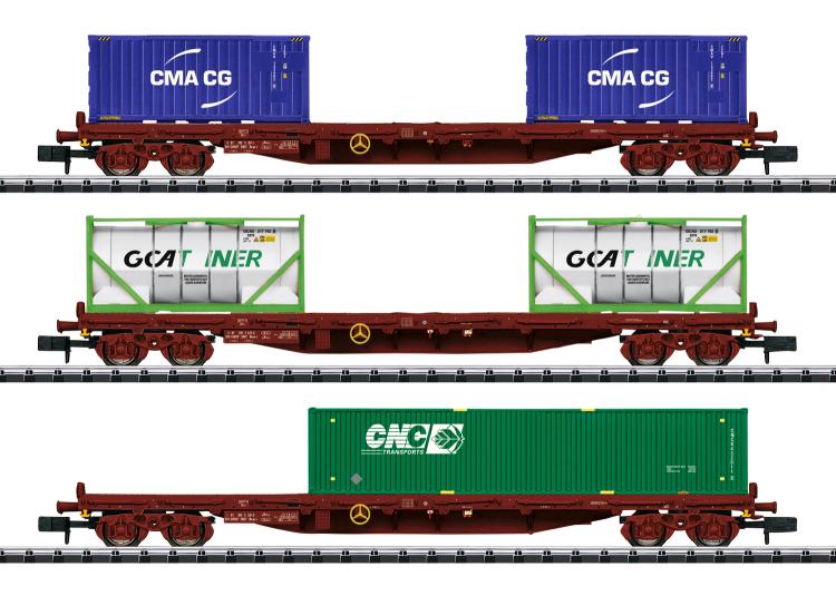ENSEMBLE DE 3 WAGONS PORTE CONTENEURS SNCF + CONTENEURS CMA CG / GCATINER / CNC TRANSPORT
