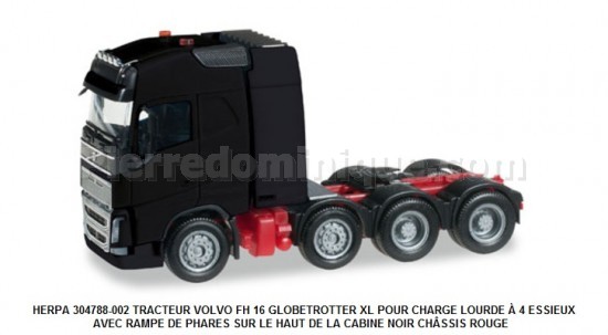 TRACTEUR VOLVO FH 16 GLOBETROTTER XL POUR CHARGE LOURDE À 4 ESSIEUX AVEC RAMPE DE PHARES SUR LE HAUT DE LA CABINE NOIR CHSSIS ROUGE