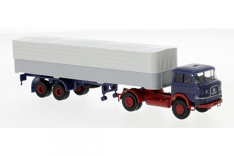 TRACTEUR KRUPP SF 980 A 2 ESSIEUS BLEU ET ROUGE SEMI-REMORQUE PLATEAU ET RIDELLE GRIS BACHE BLANCHE