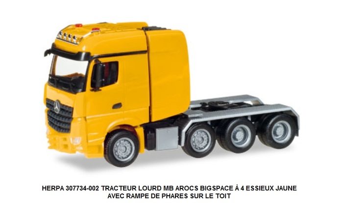 TRACTEUR LOURD MB AROCS BIGSPACE À 4 ESSIEUX JAUNE AVEC RAMPE DE PHARES SUR LE TOIT