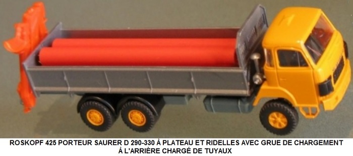 PORTEUR SAURER D 290-330 À PLATEAU ET RIDELLES AVEC GRUE DE CHARGEMENT À L'ARRIÈRE CHARGÉ DE TUYAUX