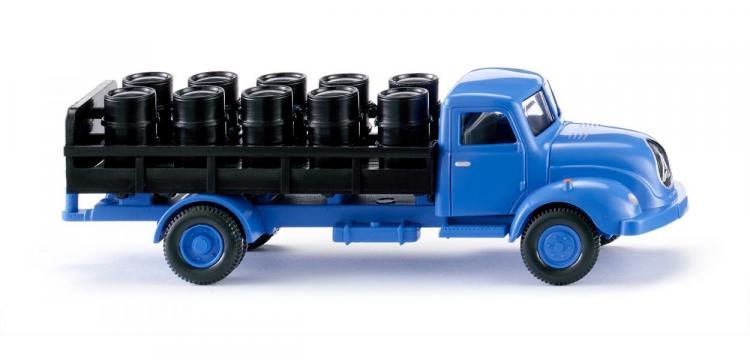 CAMION MAGIRUS S 3500 À PLATEAU ET RIDELLES BLEU CHARGE DE BIDON SCHOLVEN CHEMIE