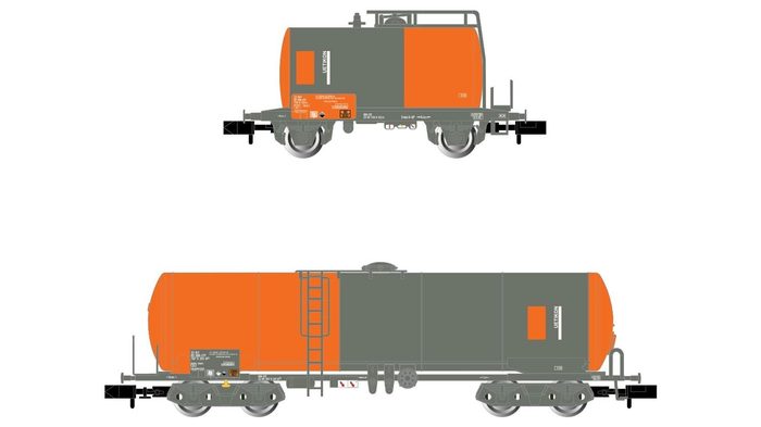 ENSEMBLE DE 2 WAGONS CITERNES A 2 ESSIEUX GAZ - LIVREE GRIS AVEC BANDE ORANGE SNCF