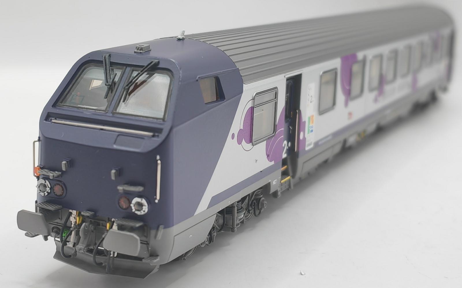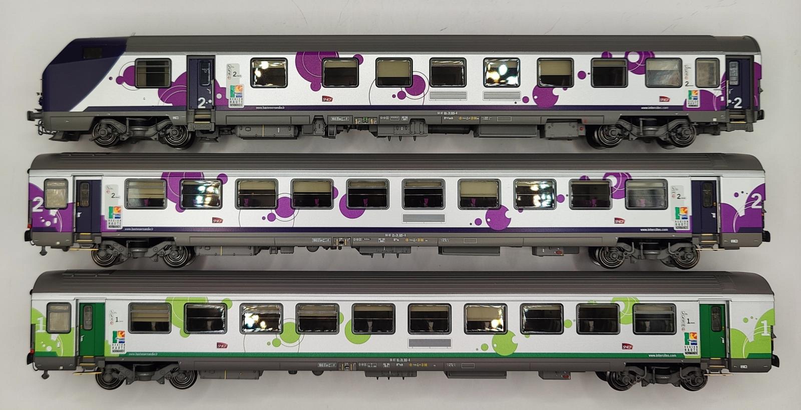 SET DE 3 VOITURES VOYAGEURS/PILOTE REVERSIBLE VU B6T2UXH + VTU B11TU + VTU A10TUH, INTERCITÉS RÉGION HAUTE-NORMANDIE, LOGO CARMILLON SNCF AC 3 RAILS - AVEC ECLAIRAGE