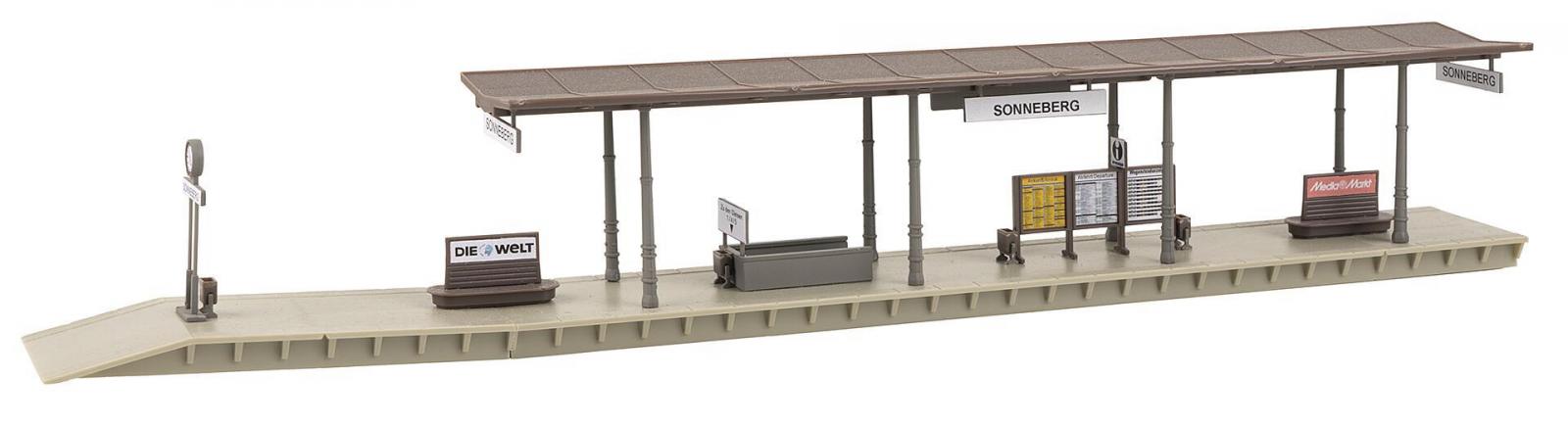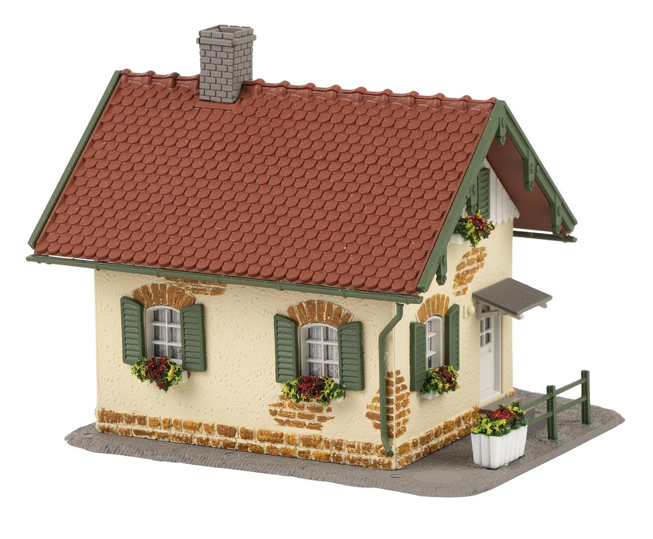 Une grande gare à charpente en bois! Ce coffret gare composé de plusieurs éléments comprend un bâtiment de gare, un quai de gare, une maison de garde-barrière et des râteliers à bicyclettes. Le grand bâtiment d’accueil avec sa tour et son hall des départs est décoré par des colombages, des murs de maçonnerie blancs et de jolies planches décoratives. Le quai de gare couvert convient à tous les systèmes de rail usuels et la hauteur du toit est ajustable. Une maisonnette de garde-barrière disposant d’un cabanon attenant et d’un bardage en planches dans le grenier, deux râteliers à bicyclettes couverts et d’autres pièces décoratives complètent la scène de gare.