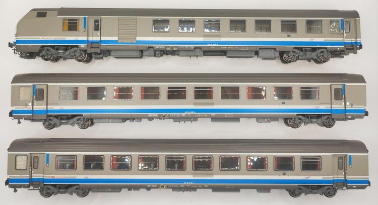 SET DE 3 VOITURES VOYAGEURS/PILOTE VU B6DUX + VTU B10TUX + VTU A10TU, LIVRÉE TER RHÔNE-ALPES, LOGO CASQUETTE SNCF DC