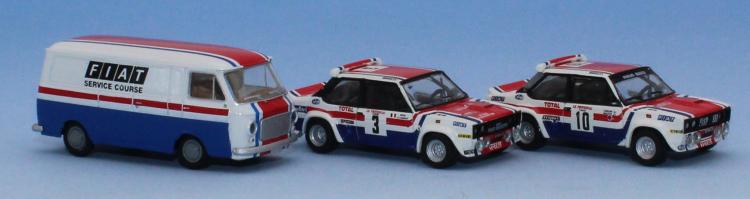 COFFRET TOUR DE CORSE 1978 AVEC 2 FIAT 131 ABARTH RALLY (NO 10, MICHÈLE MOUTON - FRANÇOISE CONCONI) (NO 3, JEAN CLAUDE ANDRUET - "BICHE") & FOURGON FIAT 238 D'ASSISTANCE