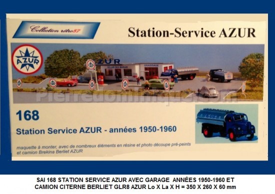 SAI 168 STATION SERVICE AZUR AVEC GARAGE ANNÉES 1950-1960 ET CAMION CITERNE BERLIET GLR8 AZUR Lo X La X H = 350 X 260 X 60 mm