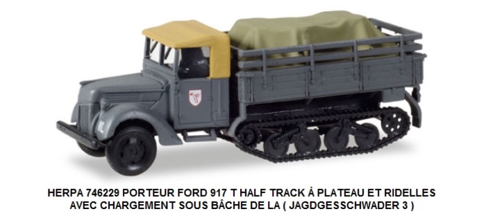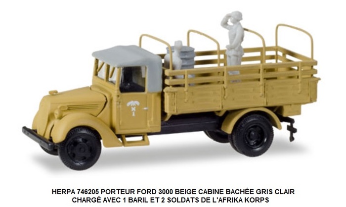 PORTEUR FORD 3000 BEIGE CABINE BACHÉE GRIS CLAIR CHARGÉ AVEC 1 BARIL ET 2 SOLDATS DE L'AFRIKA KORPS
