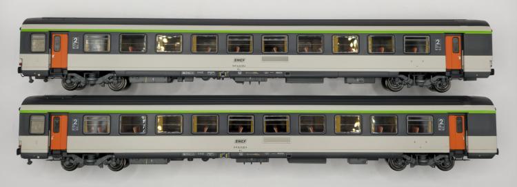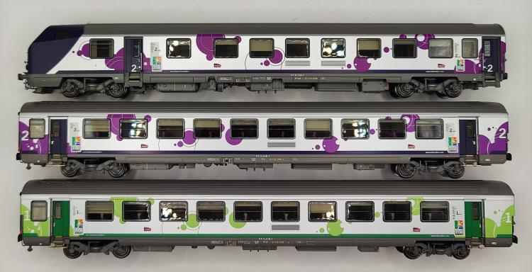 SET DE 3 VOITURES VOYAGEURS/PILOTE REVERSIBLE VU B6T2UXH + VTU B11TU + VTU A10TUH, INTERCITÉS RÉGION HAUTE-NORMANDIE, LOGO CARMILLON SNCF DC - AVEC ECLAIRAGE