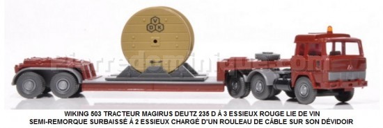 TRACTEUR MAGIRUS DEUTZ 235 D À 3 ESSIEUX ROUGE LIE DE VIN SEMI-REMORQUE SURBAISSÉ Ã€ 2 ESSIEUX CHARGÉ D'UN ROULEAU DE CBLE SUR SON DÉVIDOIR