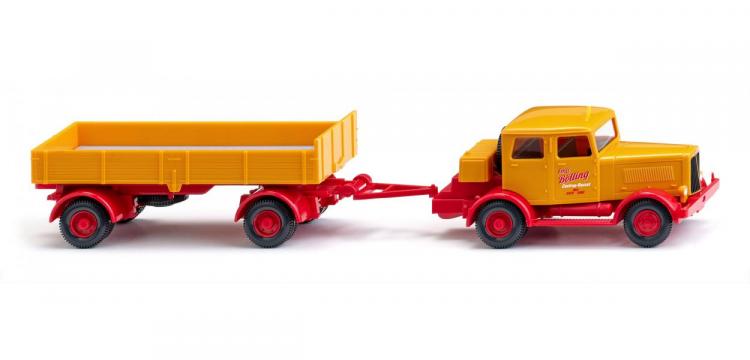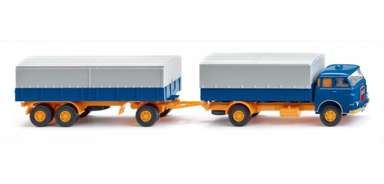 CAMION MAN PAUSBACKE AVEC REMORQUE PLATEAU BLEU BACHE GRIS CHASSI JAUNE